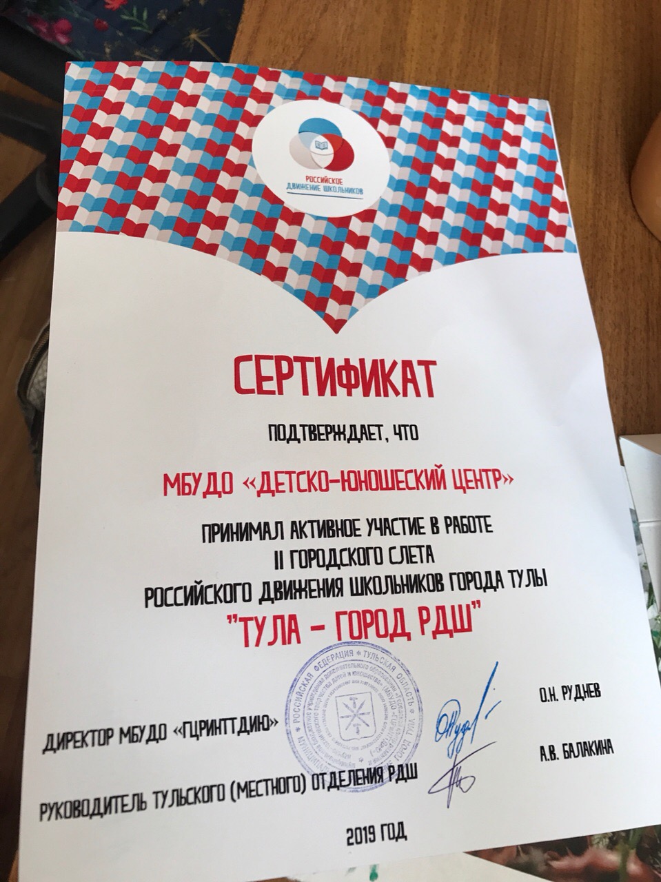 В финале мероприятия были вручены сертификаты, в том числе и отделению РДШ в МБУДО «ДЮЦ»! Городской слет прошёл ярко и незабываемо! Спасибо организаторам!