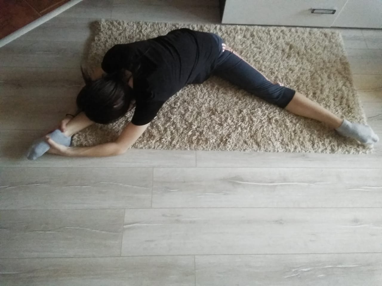 4. Растяжка ног поочередно сидя. И.п. - сидя, ноги разведены широко (насколько позволяет растяжка). Развернуть корпус вправо, опуститься вниз к ноге. Сохранить ноги прямыми, спину прямой, шея продолжает позвоночник. Задержаться в нижней точке на 30 секунд, вернуться в и.п., сделать то же самое влево. Повторить 3 раза.