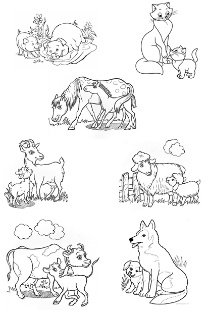 Посмотрите, пожалуйста, на картинку. Перед вами домашние животные со своими детенышами. Попробуйте назвать взрослых животных и их детенышей.