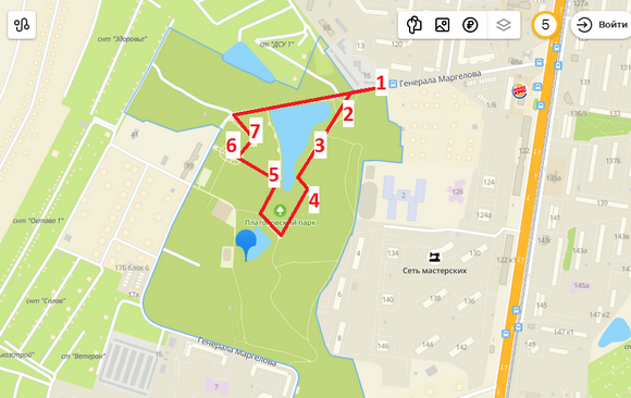 - Входим в парк с ул Генерала Маргелова со стороны ближе к проспекту Ленина (Остановка Платоновкий Парк, конечная 9 лайна)