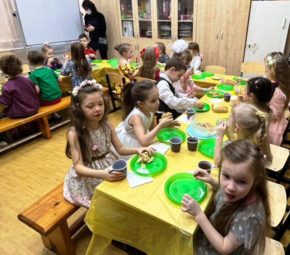В заключение ребята с удовольствием поедали вкусные блины, которые для них испекли их родные: мамы и бабушки, запивая их ароматным чаем.