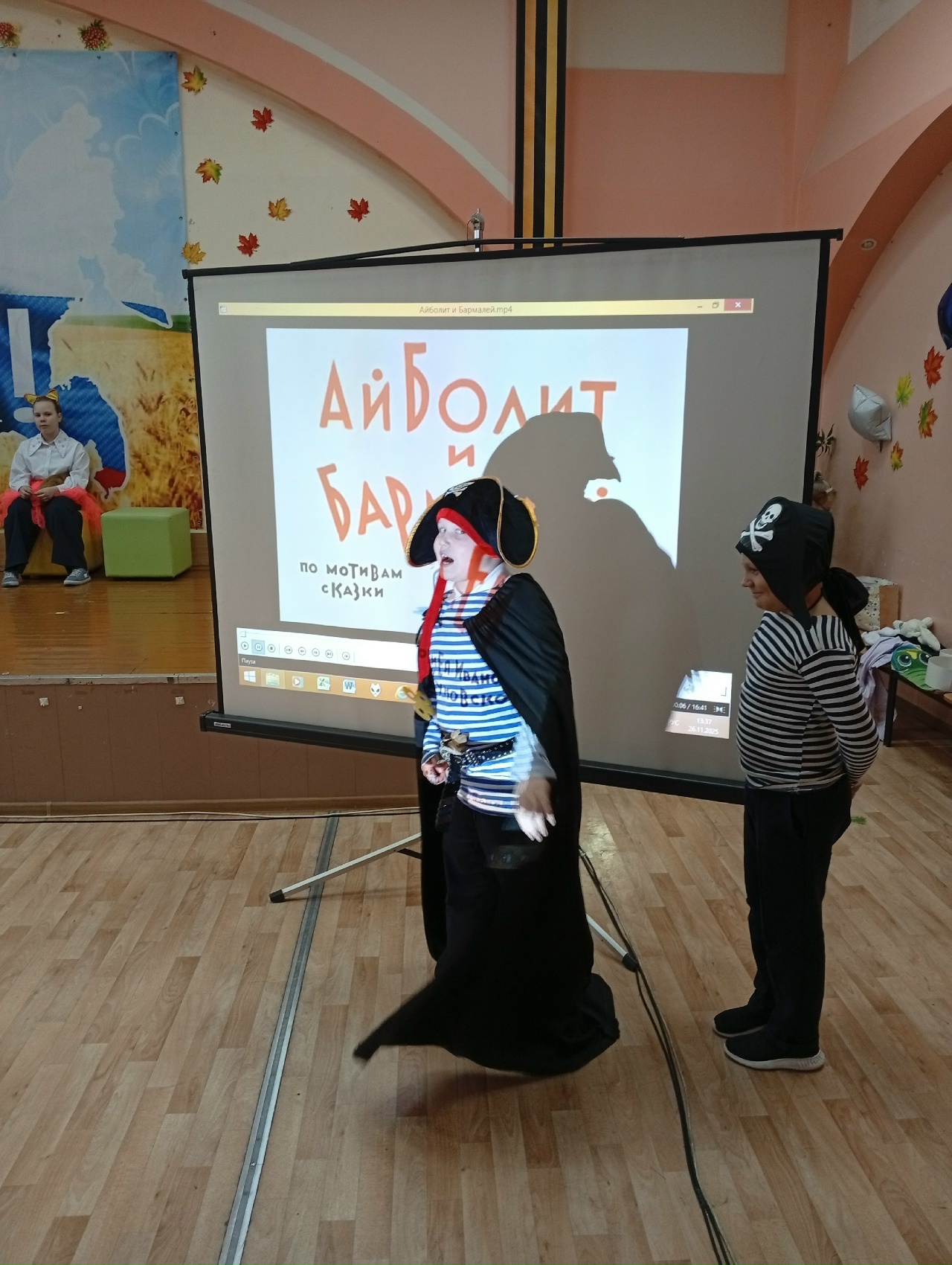 Юные артисты показали ребятам, что такое театральные декорации, костюмы и реквизит. Разыграли миниатюру по сказке К.И. Чуковского «Айболит и Бармалей».