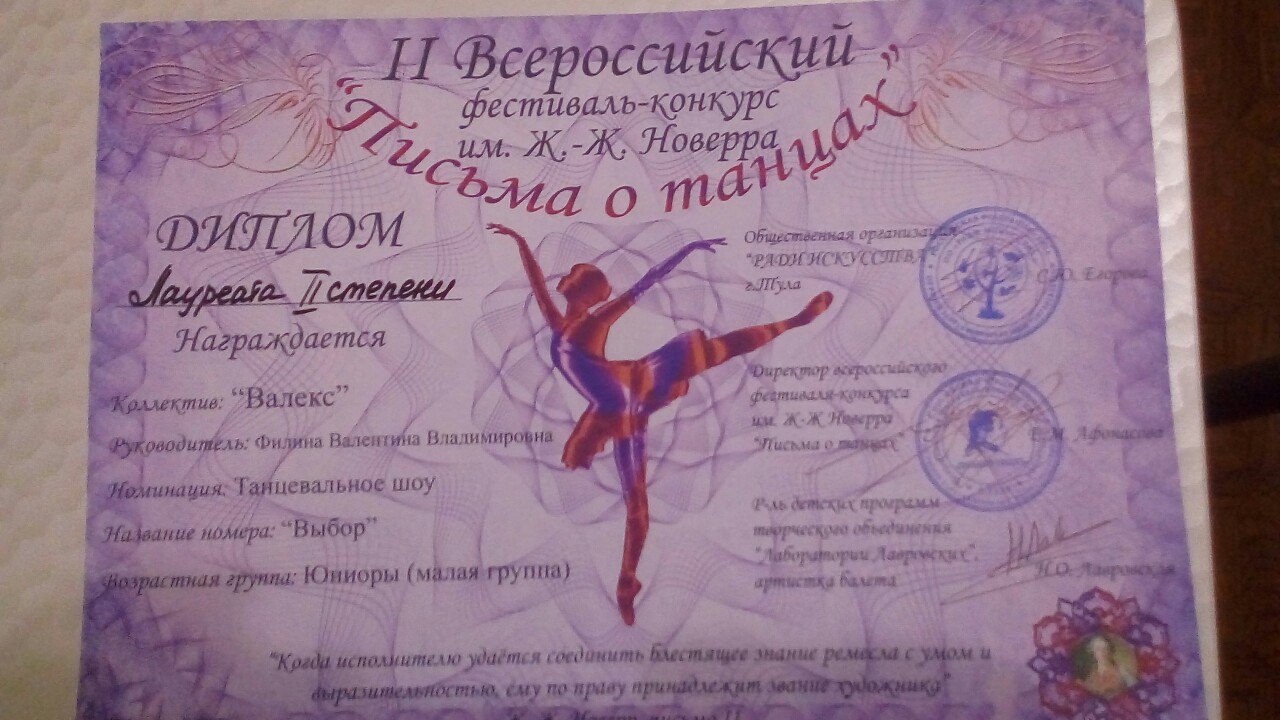 21 апреля 2018 г. ребята из ТСК «Валекс» приняли участие во всероссийском фестивале-конкурсе им. Ж.-Ж. Новерра «Письма о танцах» (номинация «Шоу программа» - юниоры, малая группа).