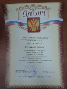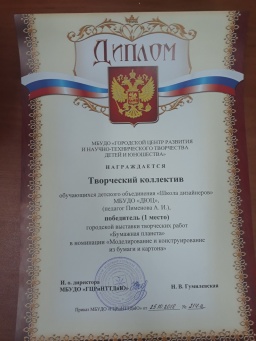 Поздравляем победителей городской выставки творческих работ «Бумажная планета» в номинации «Моделирование и конструирование из бумаги» творческий коллектив объединения «Школа дизайнеров» и Степанову Дарью, а также руководителя Пименову Алёну Игоревну! Желаем дальнейших творческих успехов!