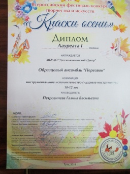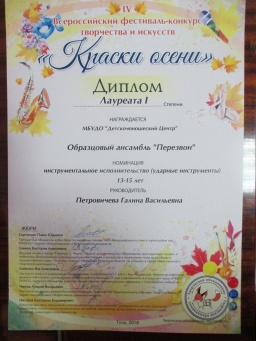 7 ноября 2018 года в Туле проходил Всероссийский конкурс-фестиваль «Краски осени», в котором принял участие детский образцовый ансамбль «Перезвон» МБУДО «Детско-юношеский Центр», педагог - Петровичева Г.В. Его участники: Новикова Алина, Исаев Игорь, Шумская Лилия, Полосина Маргарита, Фетисовы Валерия и Юлия, Смирновы Анна и Наталья возрастных категориях 9-12 лет и 13-15 лет. Ансамбль получил 2 диплома лауреата I степени. Поздравляем всех и желаем творческих успехов! Благодарим за помощь в транспортировке передвижной звонницы Полосину Инессу Львовну и ребят из ансамбля «Ассорти» под руководством Мартынова Сергея Владимировича. |