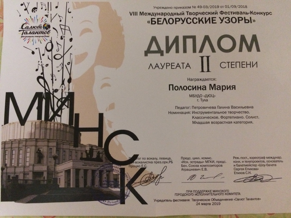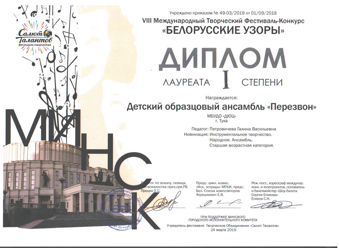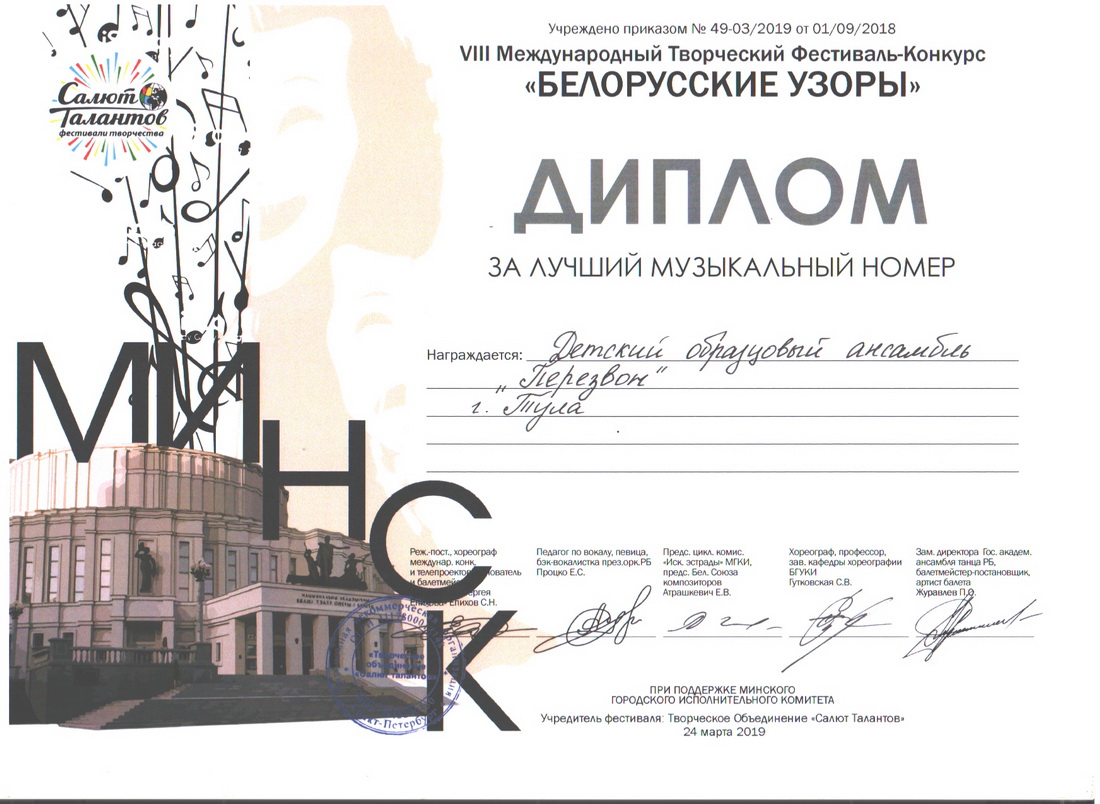 С 22 по 27 марта 2019 года детский образцовый ансамбль «Перезвон» в составе Исаева Игоря, Полосиной Маргариты, Новиковой Алины, Шумской Лилии, а также солистки Полосиной Марии (фортепиано), руководитель Петровичева Г.В., побывали в столице Беларуси г. Минске на VIII Международном творческом фестивале-конкурсе «Белорусские узоры». «Перезвон» получил диплом лауреата I степени и специальный диплом «За лучший музыкальный номер». Полосина Мария получила диплом лауреата II степени. Поздравляем с успешным выступлением! Детей и подростков сопровождали родители. Все с удовольствием познакомились с достопримечательностями города, узнали много нового на содержательных экскурсиях, посмотрели Мирский и Несвижский замки. Поездка получилась насыщенной и интересной. Особая благодарность родителям, изыскавшим возможность оплатить детям это путешествие, за помощь при транспортировке передвижной звонницы. |