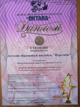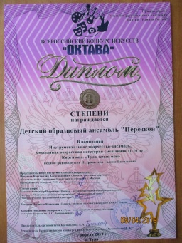7 апреля 2019 года детский образцовый ансамбль «Перезвон» принял участие во II Всероссийском конкурсе искусств «Октава» в составе: Исаева Игоря, Полосиных Маргариты и Марии, Новиковой Алины, Фетисовой Валерии, Смирновой Натальи и дебютантов: Дронова Дмитрия, Вуколовой Софии, Богачёвой Мелании, Самойловой Софии под руководством Петровичевой Г.В. «Перезвон» занял 3 место в 2-х возрастных категориях. Поздравляем с успешным выступлением! Благодарим Самойлова И.А., Мартынова С.В. и родителей за помощь при транспортировке передвижной звонницы. |