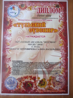 27 сентября 2020 года образцовый ансамбль «Перезвон» в составе Полосиной Марии, Богачёвой Мелании, Дроновых Дмитрия и Вероники,  Гулиной Олеси принял участие в международном конкурсе-фестивале «Тульский сувенир». Коллектив своим ярким выступлением покорил жюри и получил ГРАН-ПРИ. Поздравляем!