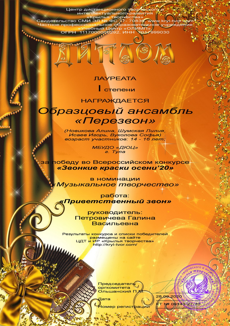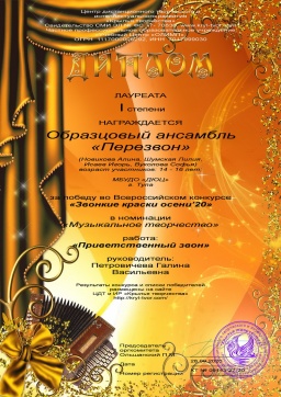 28 сентября 2020 года образцовый ансамбль «Перезвон»  принял участие в дистанционном всероссийском конкурсе  «Звонкие краски осени’20». Коллектив  в двух возрастных категориях (10-11 лет и 14-16 лет) получил 2 диплома лауреата I степени. Поздравляем!