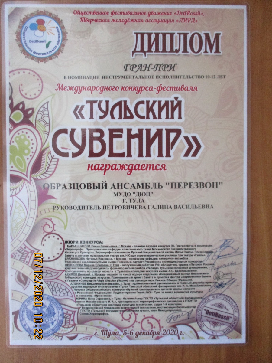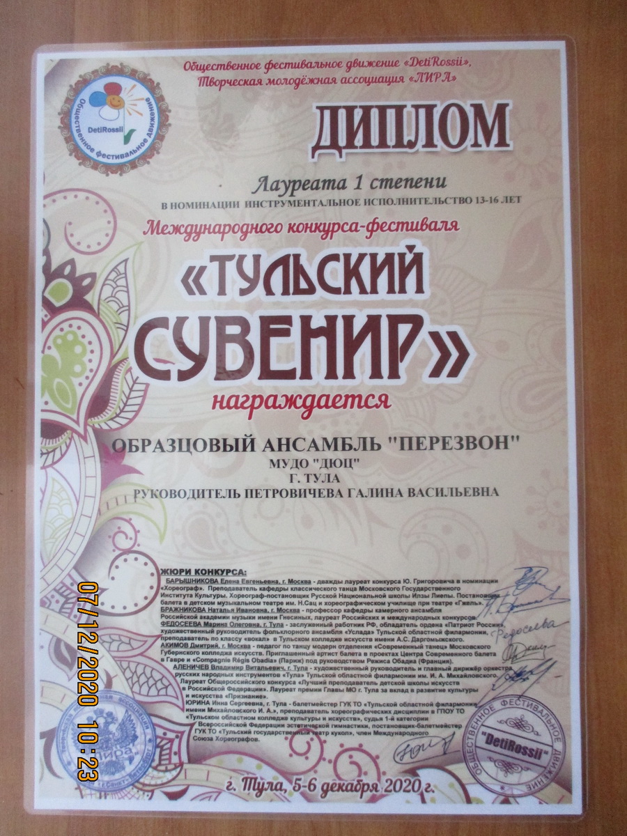 В Туле 6 декабря 2020 года проходил международный конкурс-фестиваль «Тульский сувенир», в котором принял участие образцовый ансамбль «Перезвон» в составе Новиковой Алины, Исаева Игоря, Богачёвой Мелании, Полосиной Марии, Гулиной Олеси, Дроновых Дмитрия и Вероники, Барановой Дарьи. В возрастной категории 13-16 лет ансамбль получил диплом лауреата I степени, а в возрастной категории 10-12 лет ГРАН-ПРИ. Поздравляем! Благодарим за помощь в транспортировке звонницы родителей.