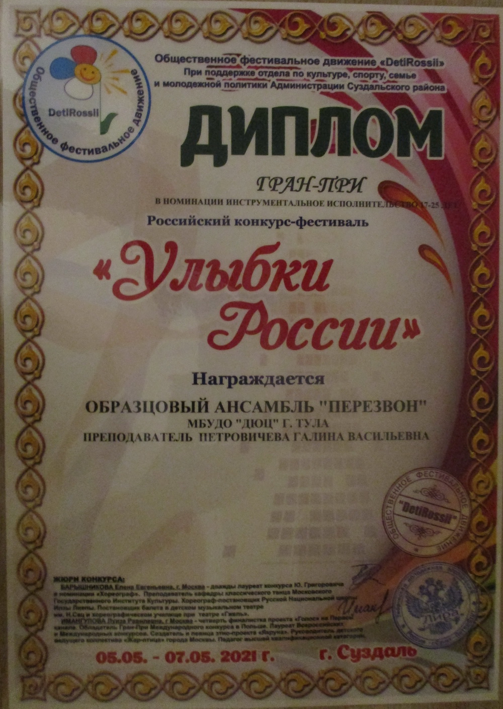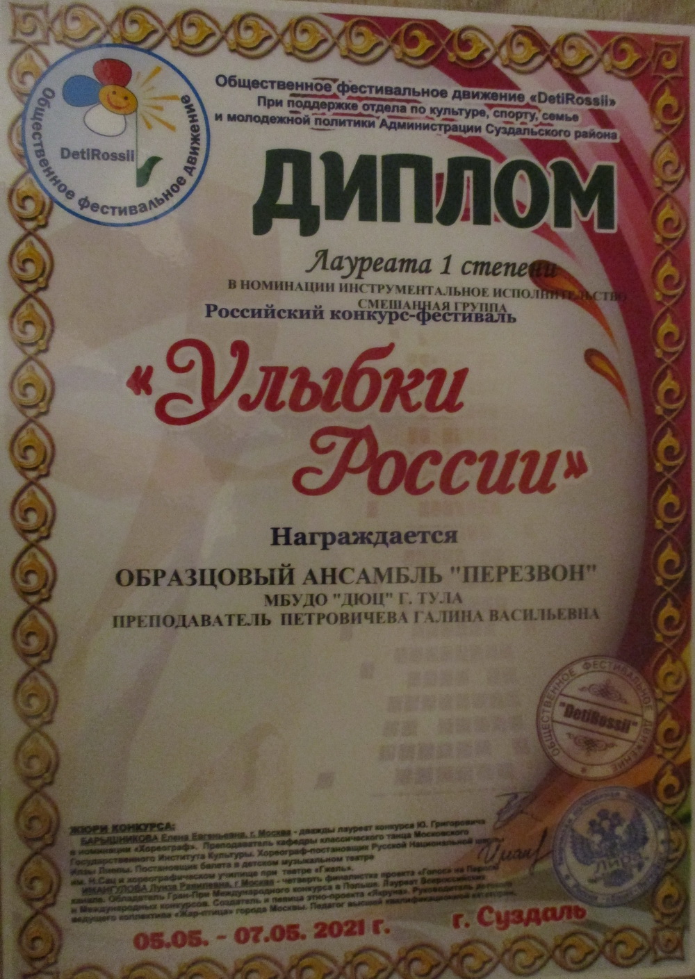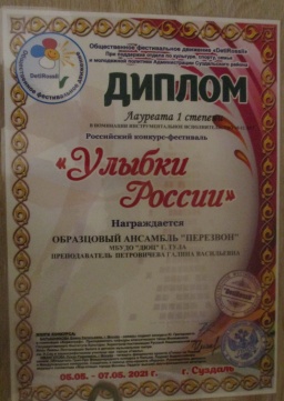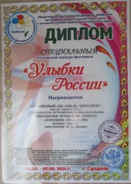 С 5 по 7 мая 2021 года в Суздале проходил всероссийский фестиваль-конкурс «Улыбки России», в котором принял участие образцовый ансамбль «Перезвон» под руководством Петровичевой Г.В. Коллектив получил 2 диплома лауреата I степени в возрастных категориях 10-12 лет и смешанной. Обладателями ГРАН-ПРИ стали участники коллектива в старшей возрастной категории. Поздравляем! «Перезвон» не только участвовал в конкурсе, но и познакомился с уникальной архитектурой древних русских городов Суздаля и Владимира. Поездка получилась интересной и эмоционально насыщенной. Благодарим родителей за помощь в транспортировке звонницы и предоставленную финансовую возможность поехать детям на конкурс. |