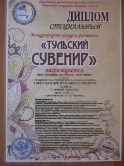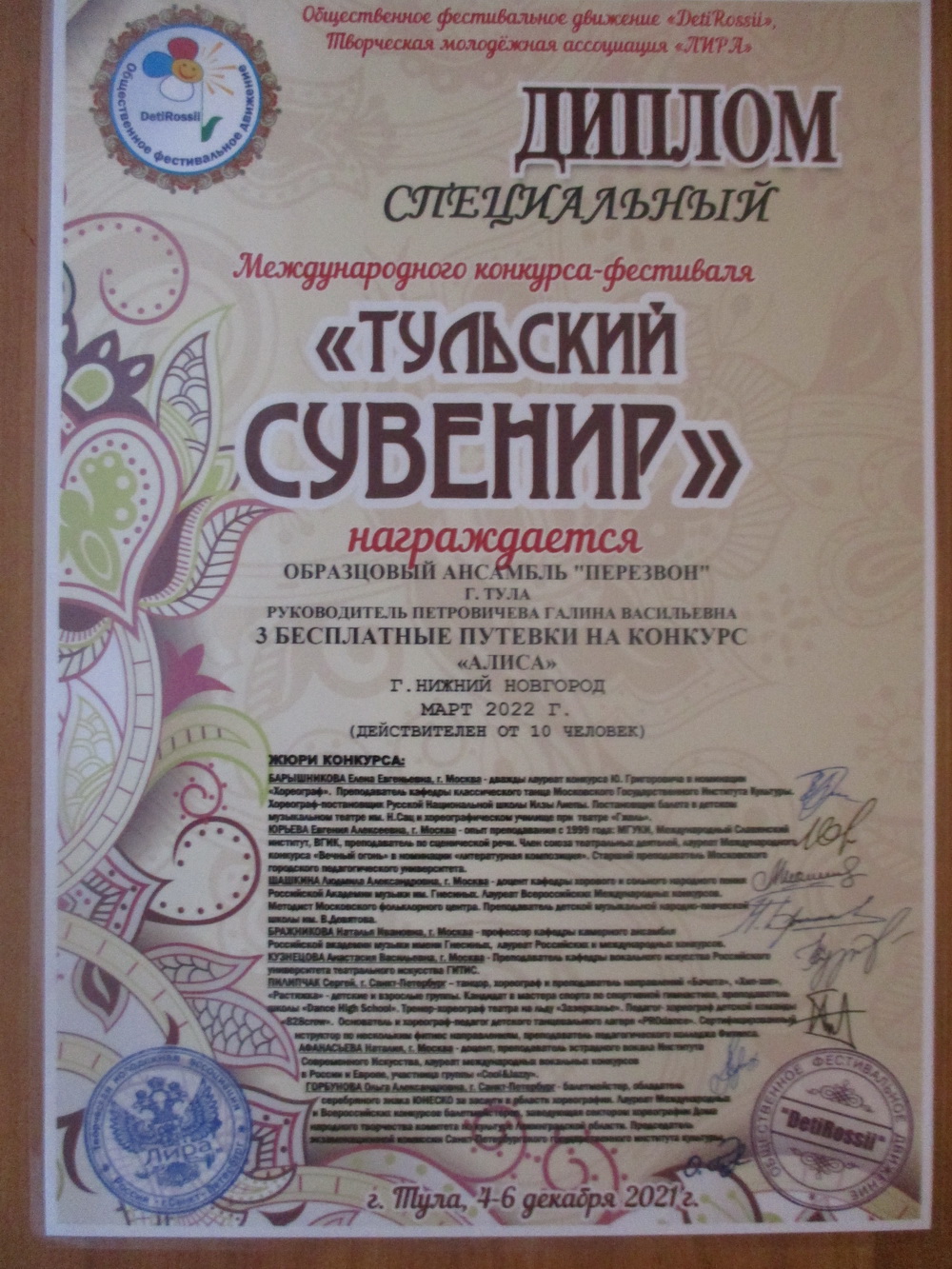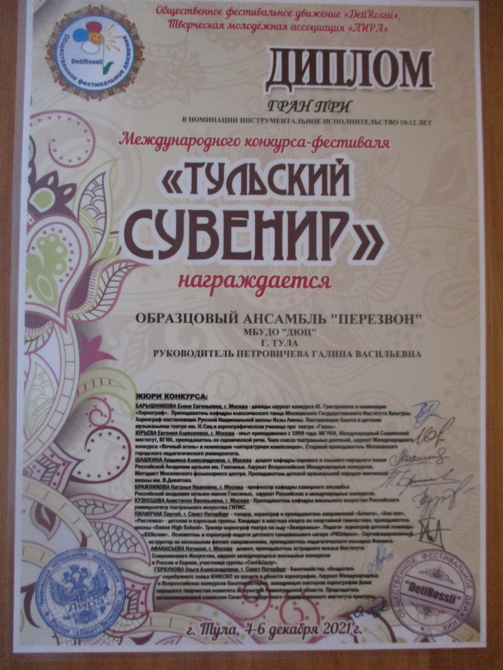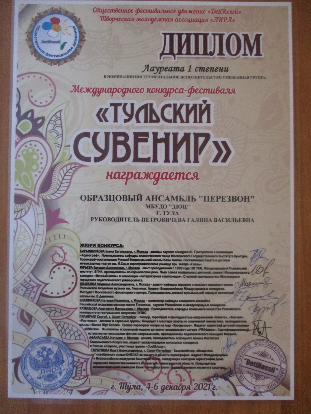 В Туле 6 декабря 2021 года проходил Международный конкурс-фестиваль «Тульский сувенир», в котором принял участие образцовый ансамбль «Перезвон» под руководством Петровичевой Г.В. Коллектив в составе Богачёвой Мелании, Барановой Дарьи, Корабельниковой Аллы , Аникушиной Елизаветы, Гулиной Олеси, Сенчук Марии, Полосиной Марии, Дроновых Дмитрия и Вероники . В возрастной категории 10-12 лет «Перезвон» получил ГРАН-ПРИ, в смешанной возрастной категории - диплом лауреата I степени и специальный диплом. Поздравляем! Благодарим за помощь в транспортировке передвижной звонницы Корабельникова А. и Аникушина А. |