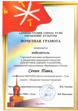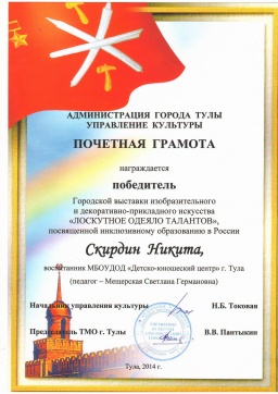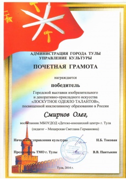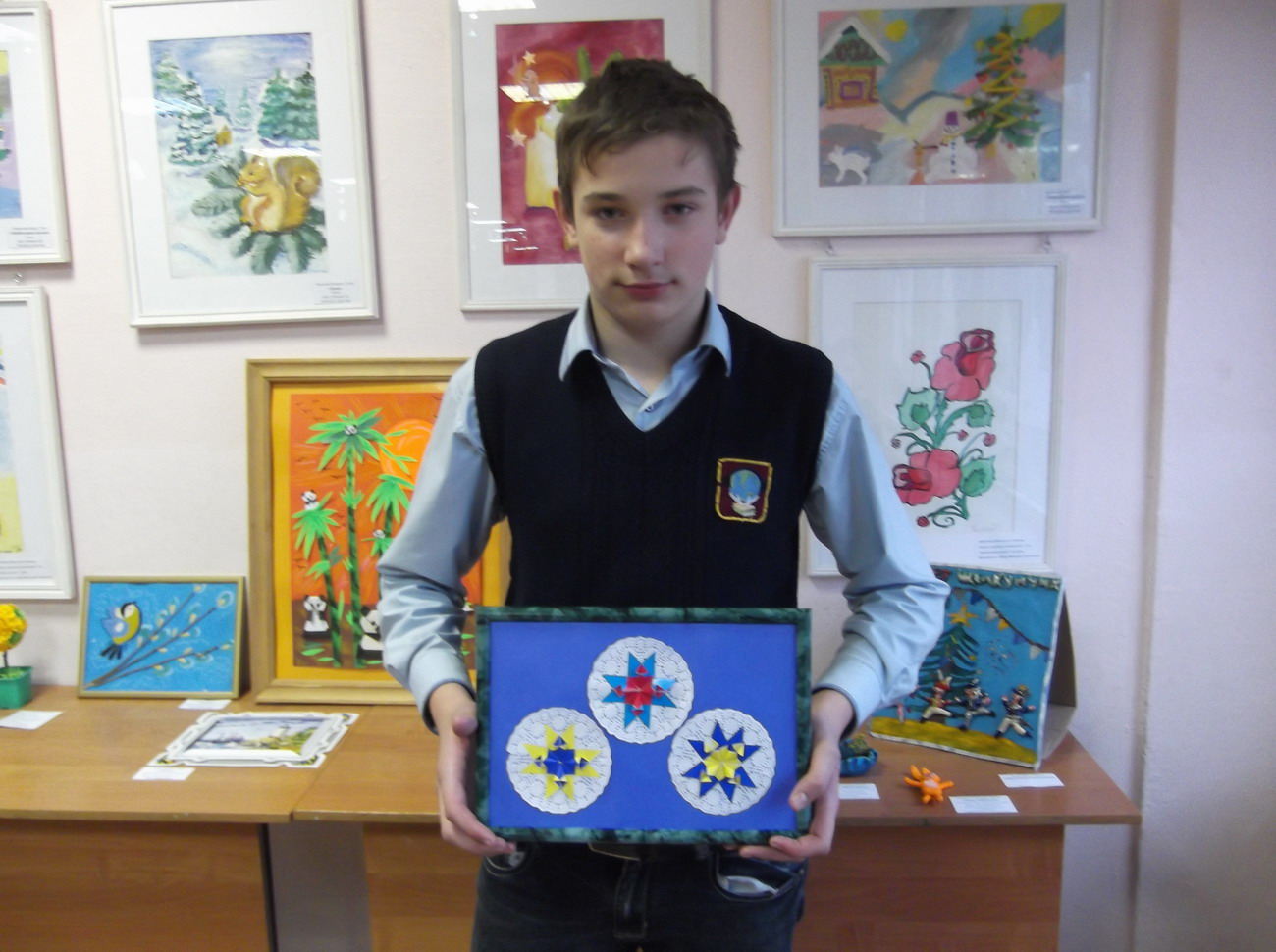 Воспитанники объединения «Бумагопластика» (педагог Мещерская Светлана Германовна) 17 декабря приняли участие в городском конкурсе арт-проектов «Лоскутное одеяло талантов». И стали победителями: Скирдин Никита, Смирнов Олег, Виданов Дмитрий, Сенин Павел (дети с ОВЗ).