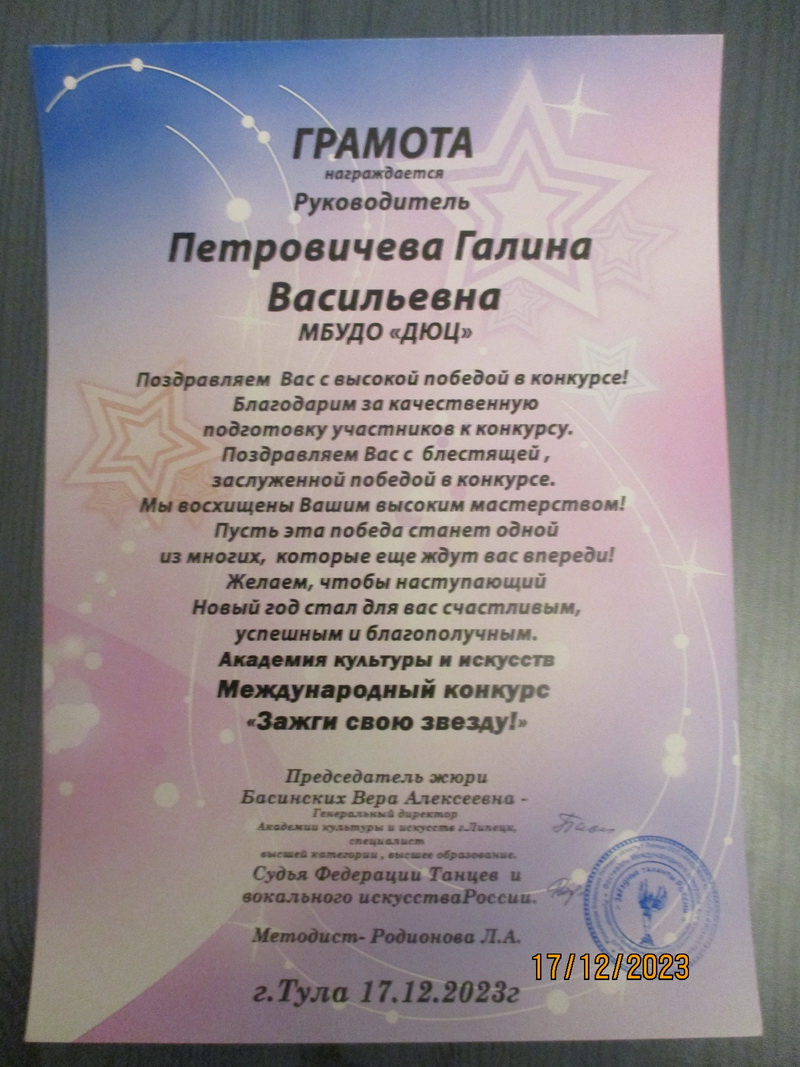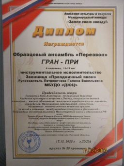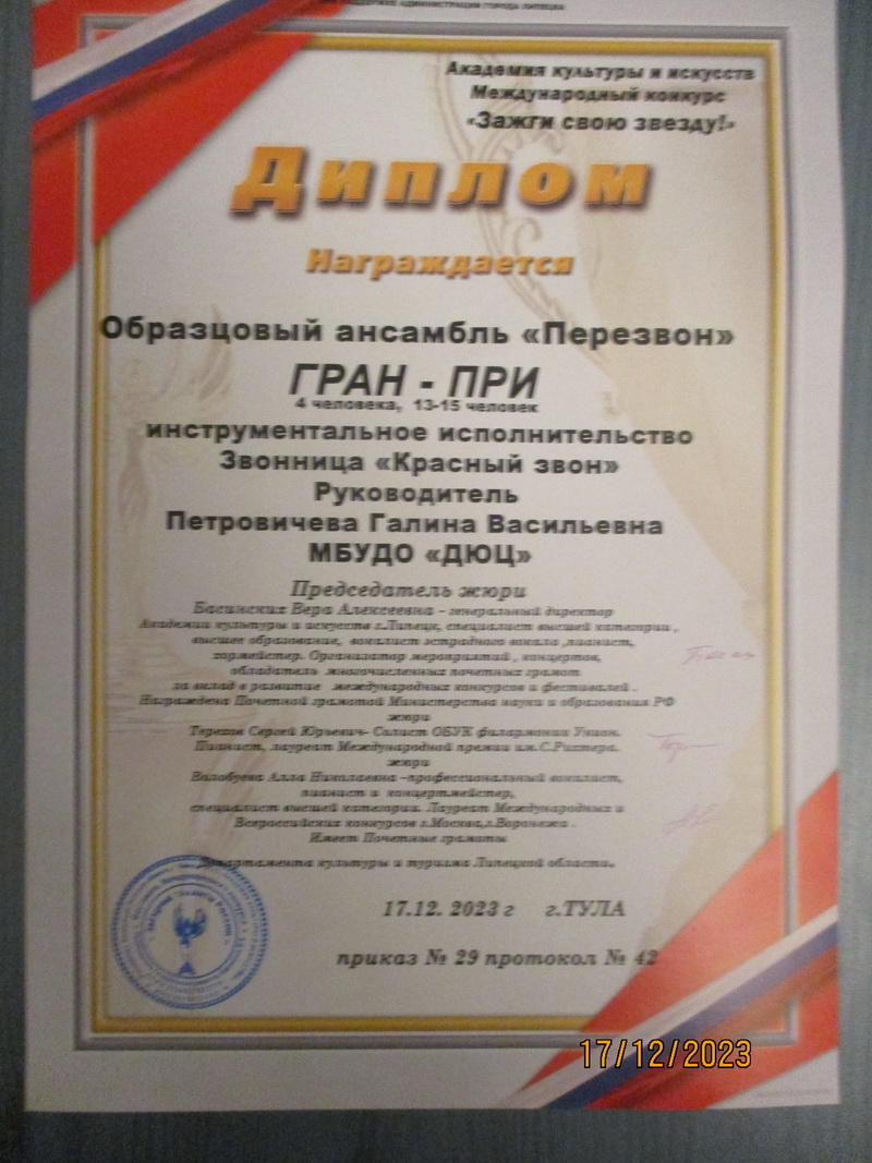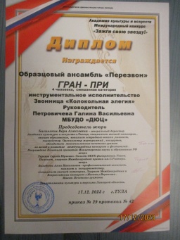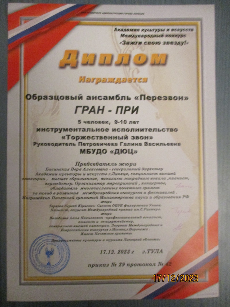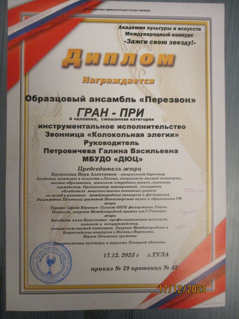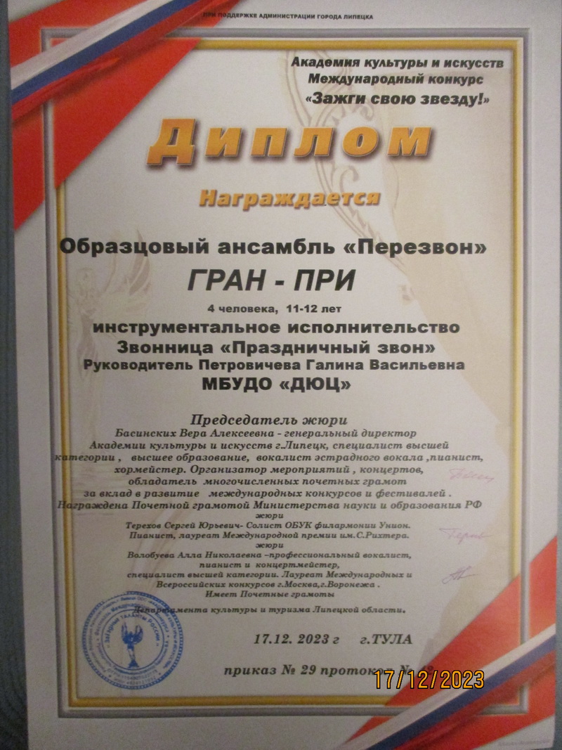 17 декабря  2023 года в Туле проходил международный конкурс «Зажги свою звезду», в котором в полном составе (17 человек) принял участие  образцовый ансамбль «Перезвон» (руководитель Петровичева Г.В.). Коллектив выступил в 4-х возрастных категориях и в каждой получил ГРАН-ПРИ. Поздравляем! Благодарим  за транспортировку передвижной звонницы Корабельникова Александра Борисовича и всех, кто оказал помощь при её перемещении.