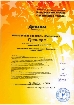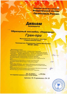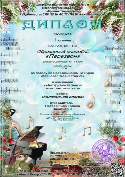 С 28 марта по 1 апреля детский образцовый ансамбль звонарей «Перезвон» (руководитель Петровичева Г.В.) принимал участие в четвёртом международном фестивале-конкурсе «Вдохновение Золотого кольца», где получил три диплома лауреата первой степени. В составе тульской группы было 15 детей и 8 взрослых. Полосина Маргарита и дуэт Смирнова Наталья - Орлова Татьяна получили дипломы лауреатов третьей степени. Кроме успешного выступления на конкурсе, ребята побывали в древних русских городах Владимире, Суздале, Костроме, Ярославле, Ростове Великом, Переславле-Залесском, Сергиевом Посаде, где познакомились с прекрасной архитектурой и получили много ярких, незабываемых впечатлений от поездки. |