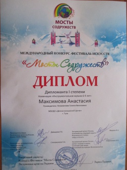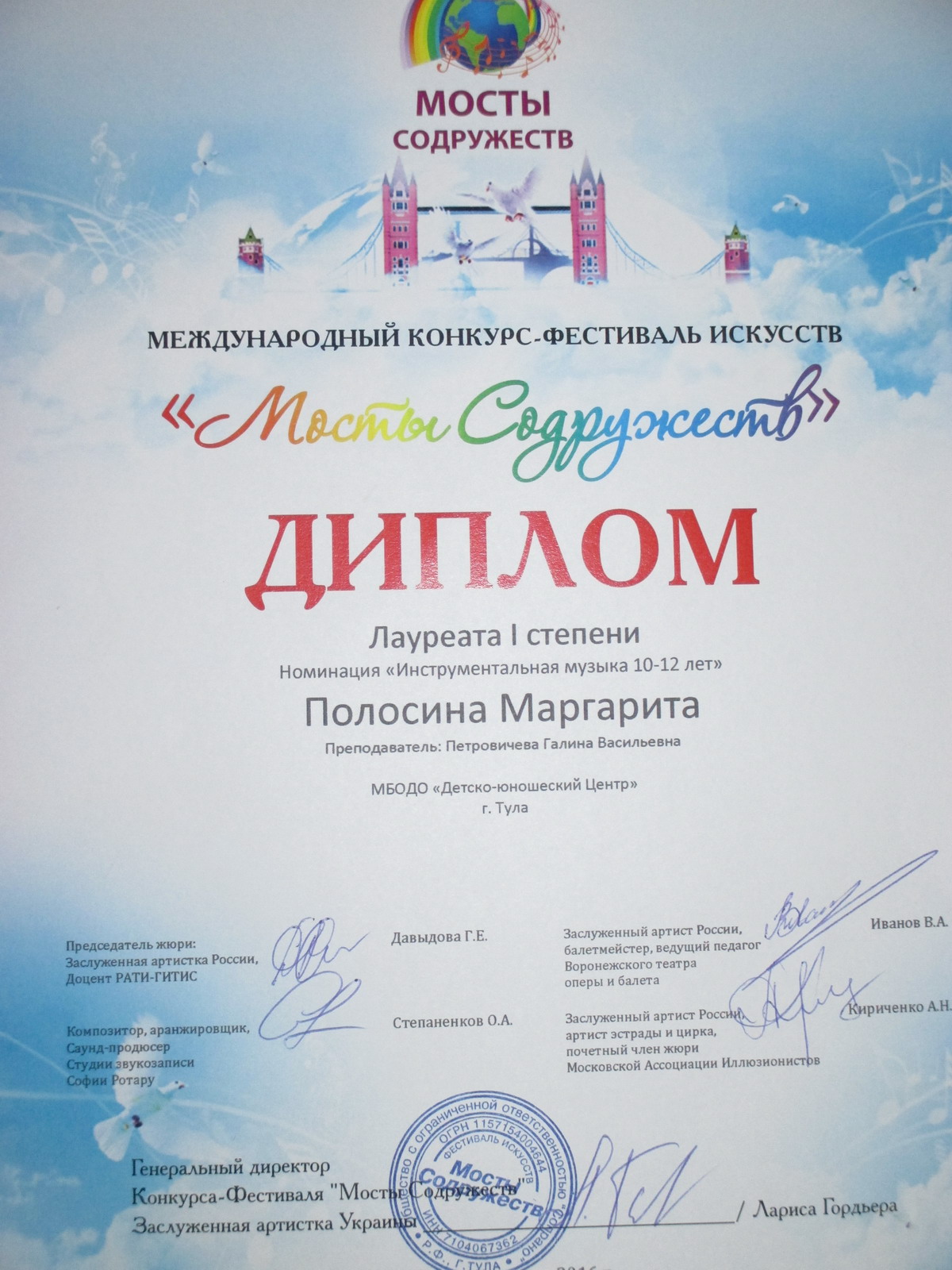 Кроме этого, в номинации «инструментальная музыка» дипломантом первой степени стала дебютантка Максимова Анастасия (7 лет,- мелодика). Полосина Маргарита (11 лет, фортепиано) получила кубок и диплом лауреата первой степени.