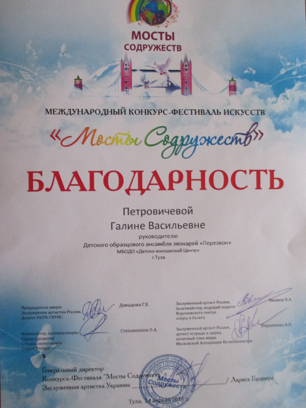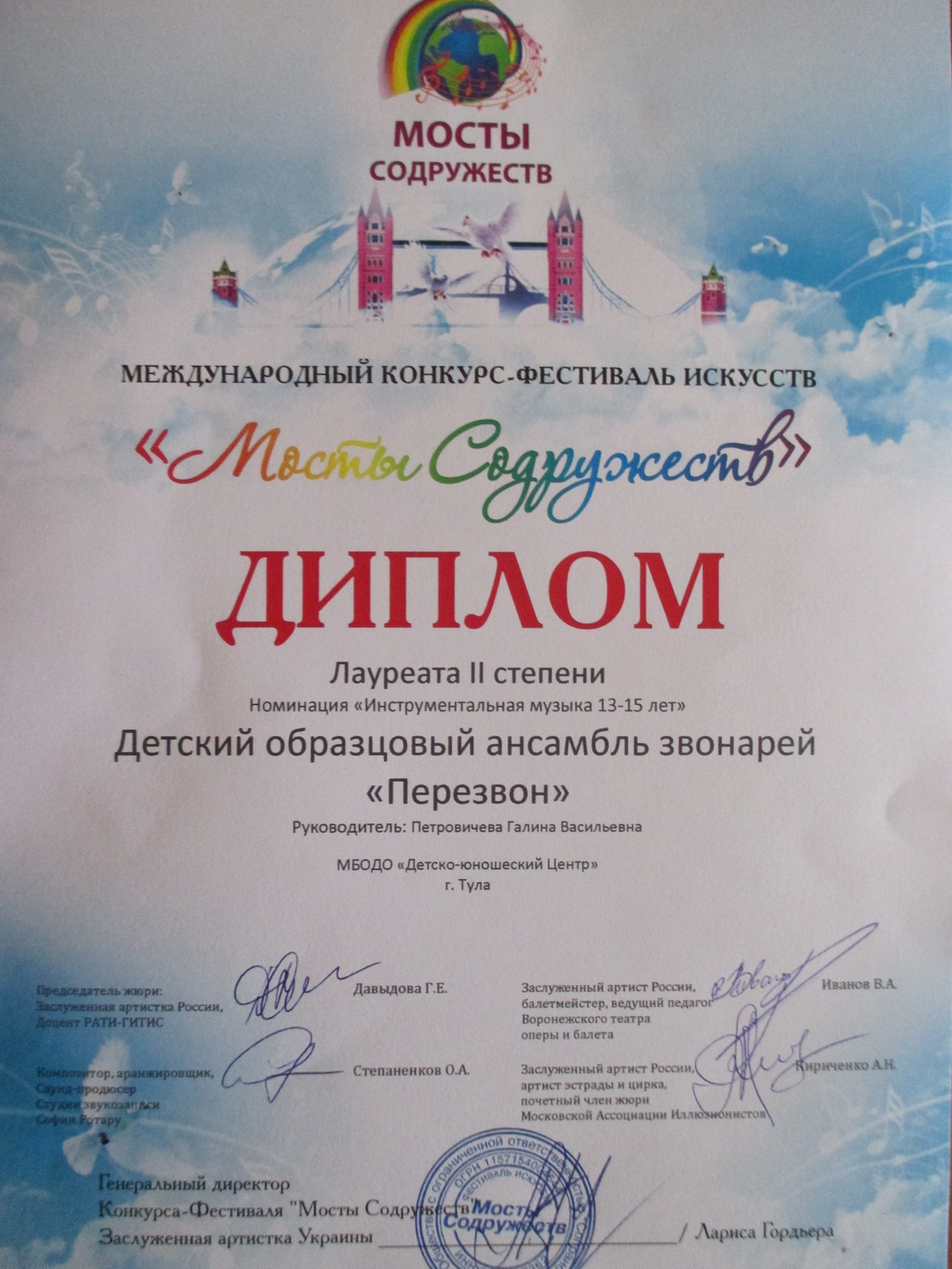24 апреля в Туле состоялся Первый Международный конкурс - фестиваль «Мосты содружеств», в котором принял участие детский образцовый ансамбль звонарей «Перезвон» (руководитель Петровичева Галина Васильевна). Коллектив получил диплом лауреата второй степени и кубок.