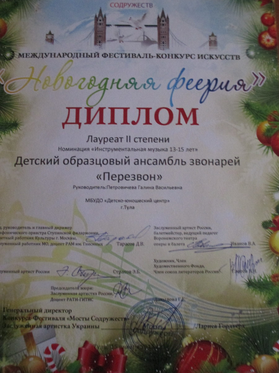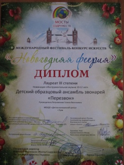 15 января 2017 года в Туле состоялся Международный фестиваль-конкурс «Новогодняя феерия», в котором принял участие детский образцовый ансамбль «Перезвон». В возрастной категории 10-12 лет Лукичёв Клим, Лукичёв Артём, Новикова Алина и Смирнова Аня стали лауреатами 3 степени. Подписнова Яна, Кирилова Вика, Фетисова Лера и Букрина Алина стали лауреатами 2 степени в возрастной категории 13-15 лет. Фортепианный дуэт Полосина Маргарита и Смирнова Анна получили диплом лауреата 2 степени. Поздравляем! Благодарим за помощь в транспортировке передвижной звонницы Фетисову Э. и Макарова М. |