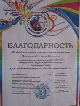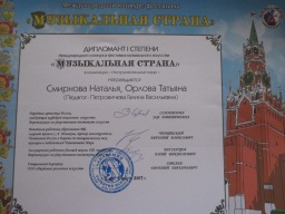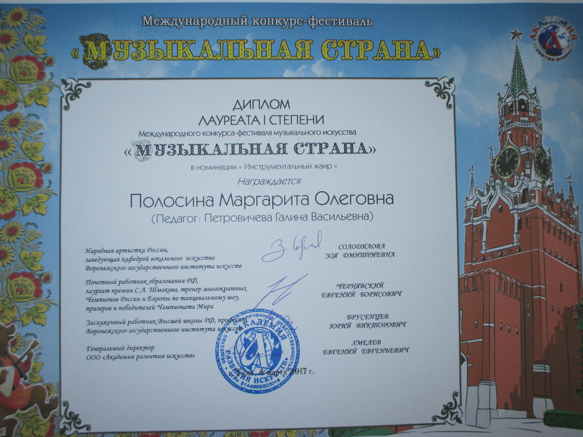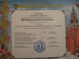 4 марта в Туле проходил Международный конкурс-фестиваль «Музыкальная страна», в котором принимал участие детский образцовый ансамбль «Перезвон» (руководитель Петровичева Г.В.). Коллектив,  в составе Исаева Игоря, Новиковой Алины, Смирновой Анны, Фетисовой Леры, Подписновой Яны,  стал лауреатом I степени.  Лауреатом I степени стала  и Полосина Маргарита (фортепиано), а  дуэт  Смирнова Наталья, Орлова Татьяна (мелодика)- дипломантами I степени. Поздравляем!