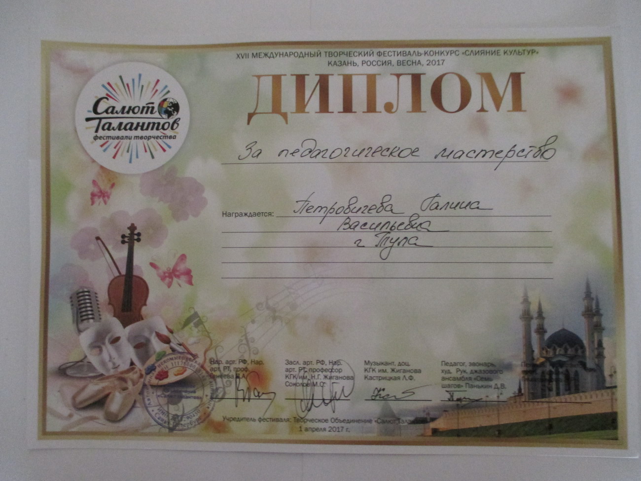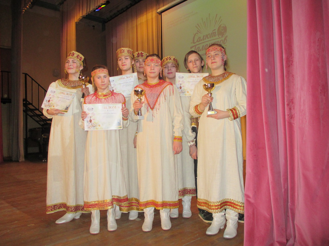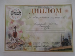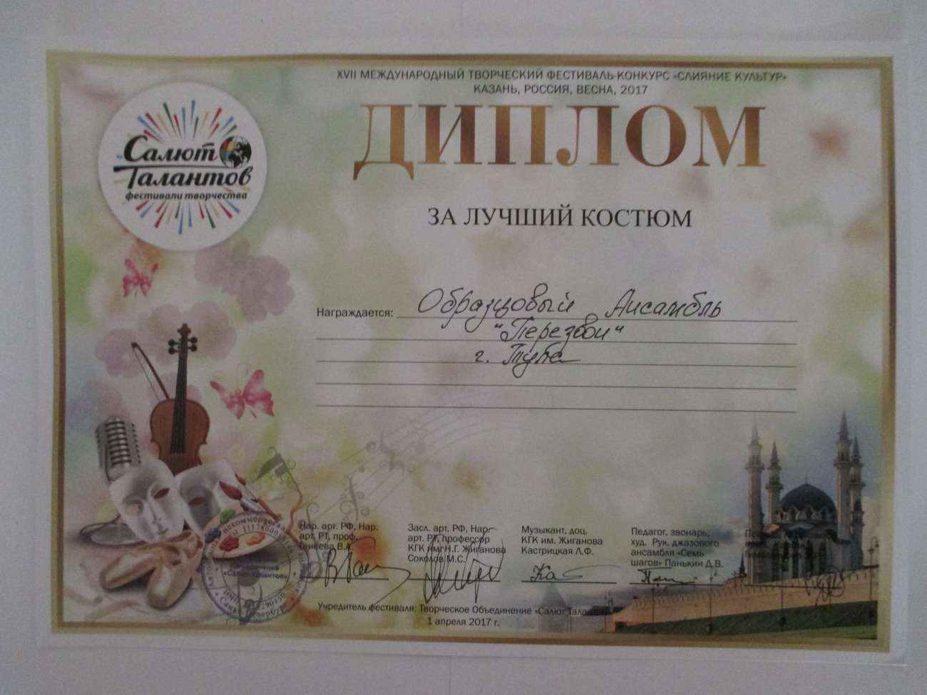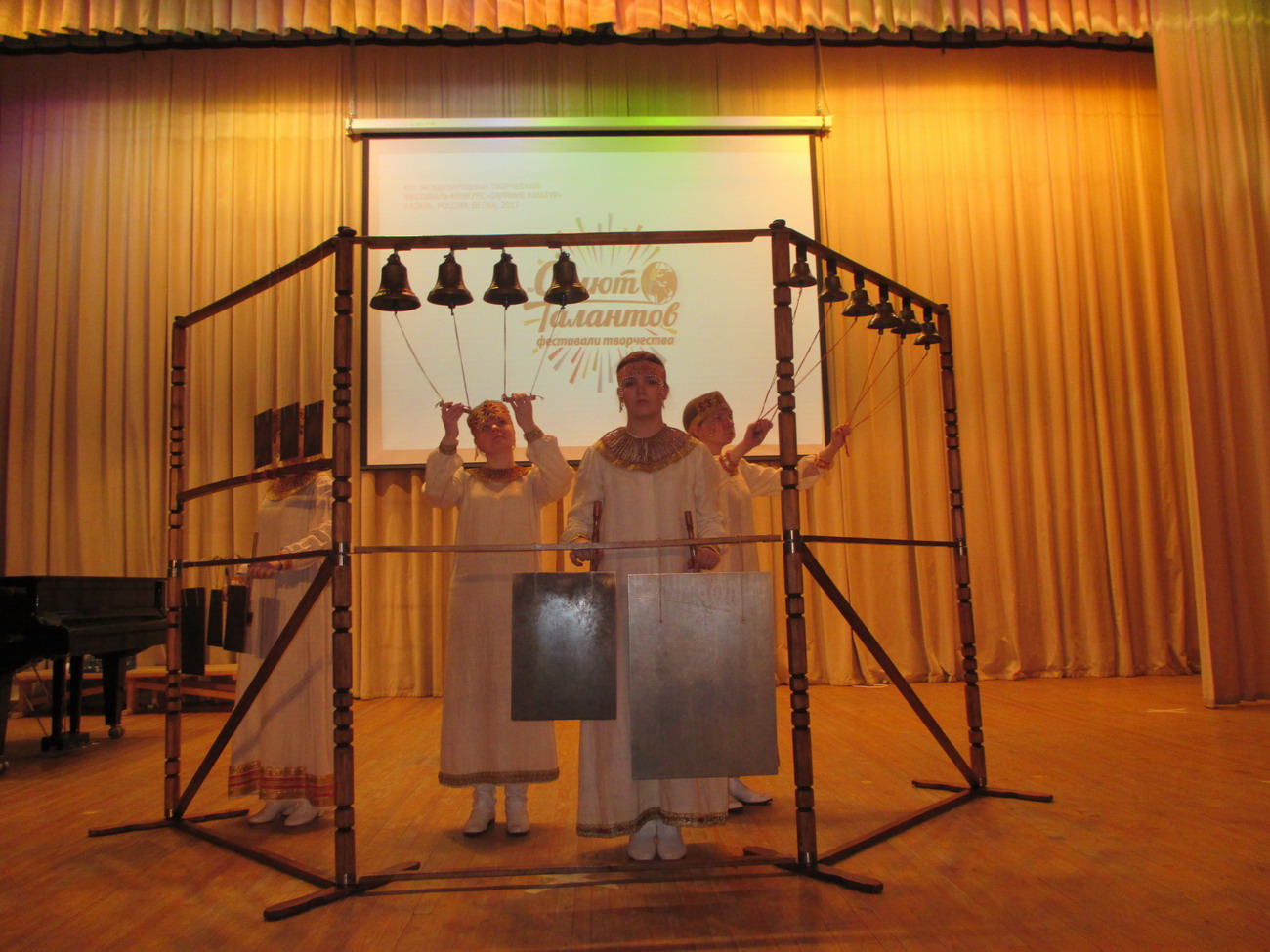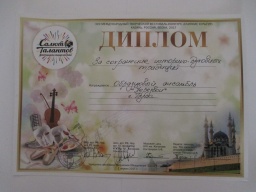 С 30.03 по 04.04.2017 детский образцовый ансамбль «Перезвон» (руководитель Петровичева Г.В.) принимал участие в Международном фестивале-конкурсе «Слияние культур» в г. Казань. Выступление коллектива было успешным: младшая возрастная группа (Новикова Алина, Смирнова Наталья, Лукичёв Артём и дебютантка фестиваля Орлова Татьяна), средняя возрастная группа (Смирнова Анна, Ястребков Дмитрий, Новикова Алина, Полосина Маргарита), старшая возрастная группа (Ивлева Полина, Подписнова Яна, Фетисова Лера, Букрина Алина) и смешанная старшая возрастная группа (Кирилова Вика, Ивлева Полина, Прокопченко Светлана, Гречишкина Женя) получили дипломы лауреатов 1 степени и кубки. Также образцовый ансамбль «Перезвон» получил 2 специальных приза: дипломы за сохранение историко-духовных традиций, и за лучший костюм. Руководитель коллектива получила диплом за педагогическое мастерство. Кроме того, участники ансамбля познакомились с замечательным древним городом Казань, его историей, культурными ценностями. Вместе с детьми Казань посетили родители, бабушки и дедушка, которые очень помогли при транспортировке передвижной звонницы. Поездка получилась насыщенной и запоминающейся. |