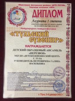3 декабря 2017 года детский образцовый ансамбль «Перезвон» в составе Ястребкова Дмитрия, Фетисовой Валерии, Новиковой Алины и Коробовой Марьи принял участие в Международном  конкурсе-фестивале «Тульский сувенир». В номинации инструментальное исполнительство в возрастной категории 13-16 лет коллектив получил диплом лауреата I степени. Поздравляем! Благодарим за помощь в транспортировке передвижной звонницы Фетисову Элеонору Владимировну и Роя Вадима.