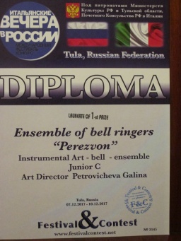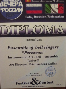 С 7 по 10 декабря 2017 года в Туле проходил Международный конкурс «Итальянские вечера в России». Детский образцовый ансамбль «Перезвон» стал его участником. Более 1300 человек в разных номинациях и возрастных категориях показывали своё мастерство, которое оценивали члены жюри из Италии. В возрастной категории 9-12 лет ансамбль «Перезвон» представляли Исаев Игорь, Новикова Алина, Смирнова Наталья, Шумская Лилия, в возрастной категории 13-15 лет выступали Полосина Маргарита, Смирнова Анна, Фетисова Валерия, Ястребков Дмитрий. Оба состава «Перезвона» стали лауреатами I степени. Поздравляем с успешным выступлением! Благодарим за помощь в транспортировке передвижной звонницы педагога ДЮЦ Мартынова С.В. и Алексея Павловича. |
