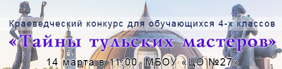 14 марта 2018 года МБУДО «Детско-юношеский Центр» на базе МБОУ «Центр образования № 27» (учебный корпус № 2) был организован городской краеведческий конкурс «Тайны тульских мастеров». В конкурсе участвовали 18 команд учащихся 4-х классов из 15 образовательных организаций города. Участники конкурса соревновались в знании истории оружейного, пряничного, самоварного и гармонного производств.