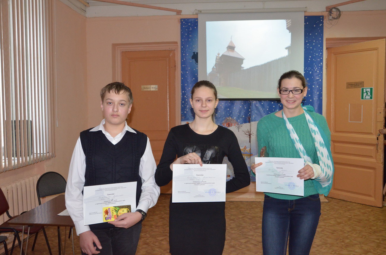 16 февраля 2016 года в МБОДО «Детско-юношеский Центр» состоялся городской краеведческий конкурс для обучающихся 8 – 10 классов образовательных организаций города «Тульские рубежи», посвящённый Дню защитника Отечества. Тема конкурса – история Тульского кремля и Тульских засек. Победителем стала Мария Арефьева (МБОУ «Центр образования № 6»), второй результат у Анастасии Никишиной (МБОУ «Центр образования № 6», школа № 67), на третьем месте - Владислав Петрусёв (МБОУ «Центр образования № 40», школа № 50). Поздравляем победителей!
