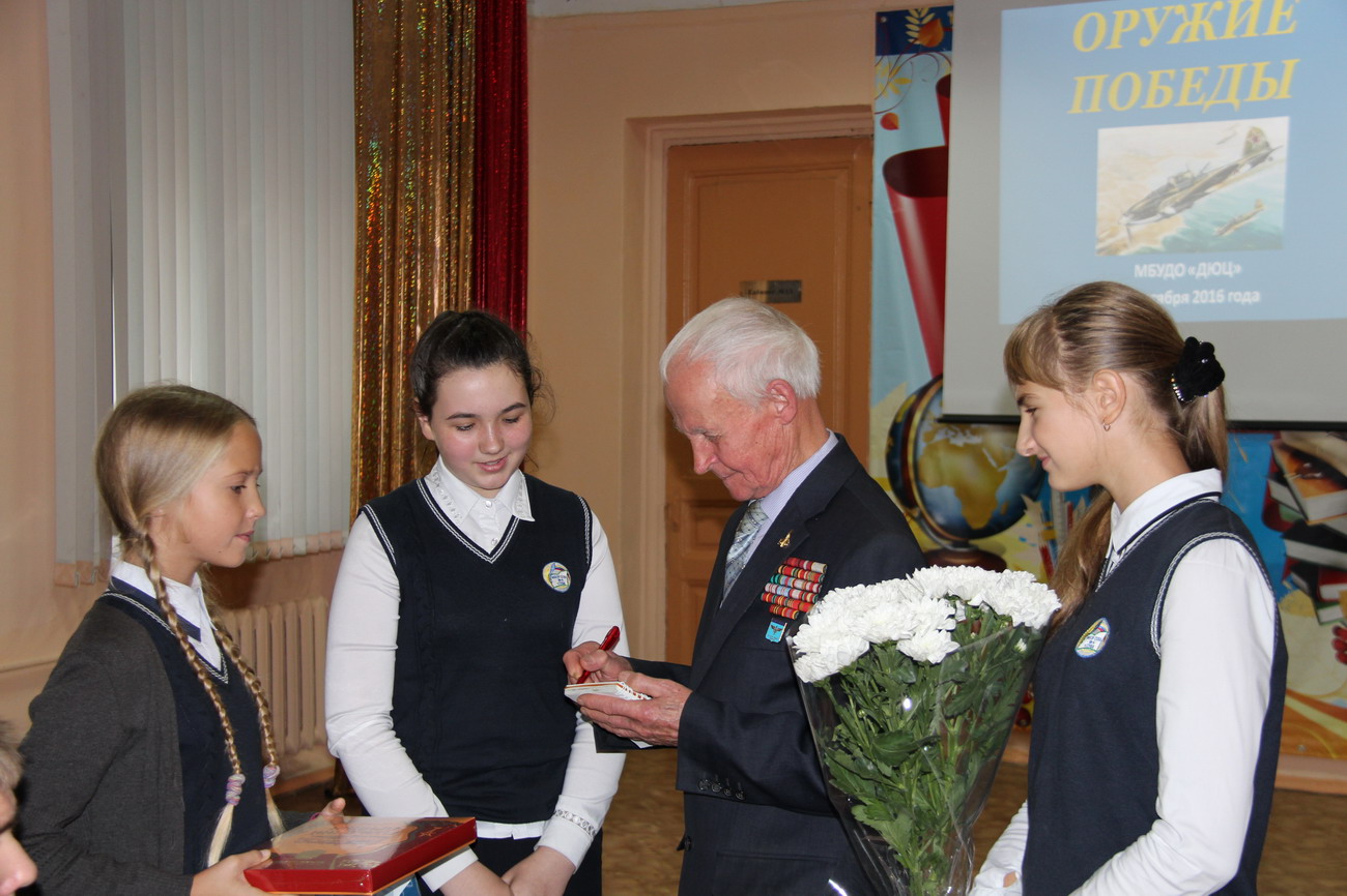 14 октября 2016 года в МБУДО «Детско-юношеский Центр» состоялась традиционная встреча обучающихся Центра образования № 27 и Центра образования № 1 с замечательным туляком Николаем Ивановичем Кульповым. Такие встречи проводятся ежегодно и посвящаются памяти Героя Советского Союза – лётчика-штурмовика Н.А. Васина.